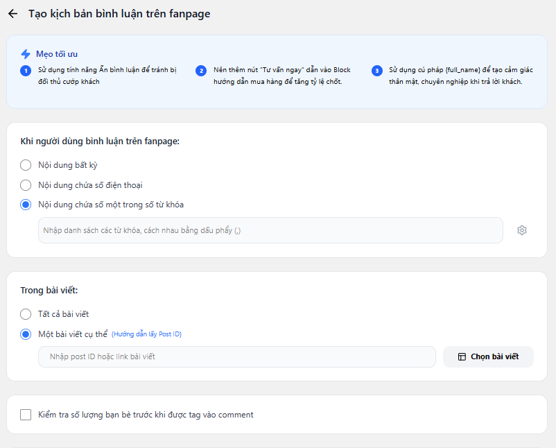 - Áp dụng chatbot trả lời tự động cho toàn bộ bài viết trên fanpage