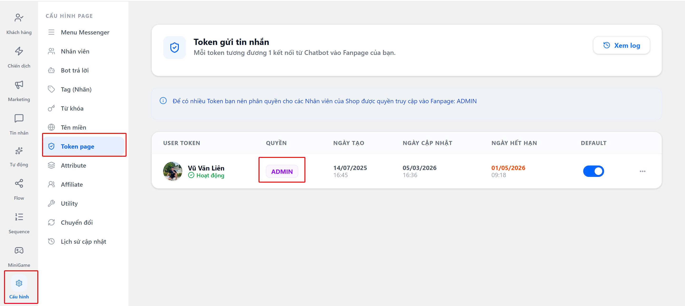 Đầu tiên, bạn vào mục Cài đặt page >> Token kiểm tra và đảm bảo không có token nào bị lỗi (nếu có token lỗi, bạn cần xóa token lỗi đi hoặc báo tài khoản lỗi đăng xuất > đăng nhập lại để token của các tài khoản đó hoạt động) và làm mới lại quyền của page.