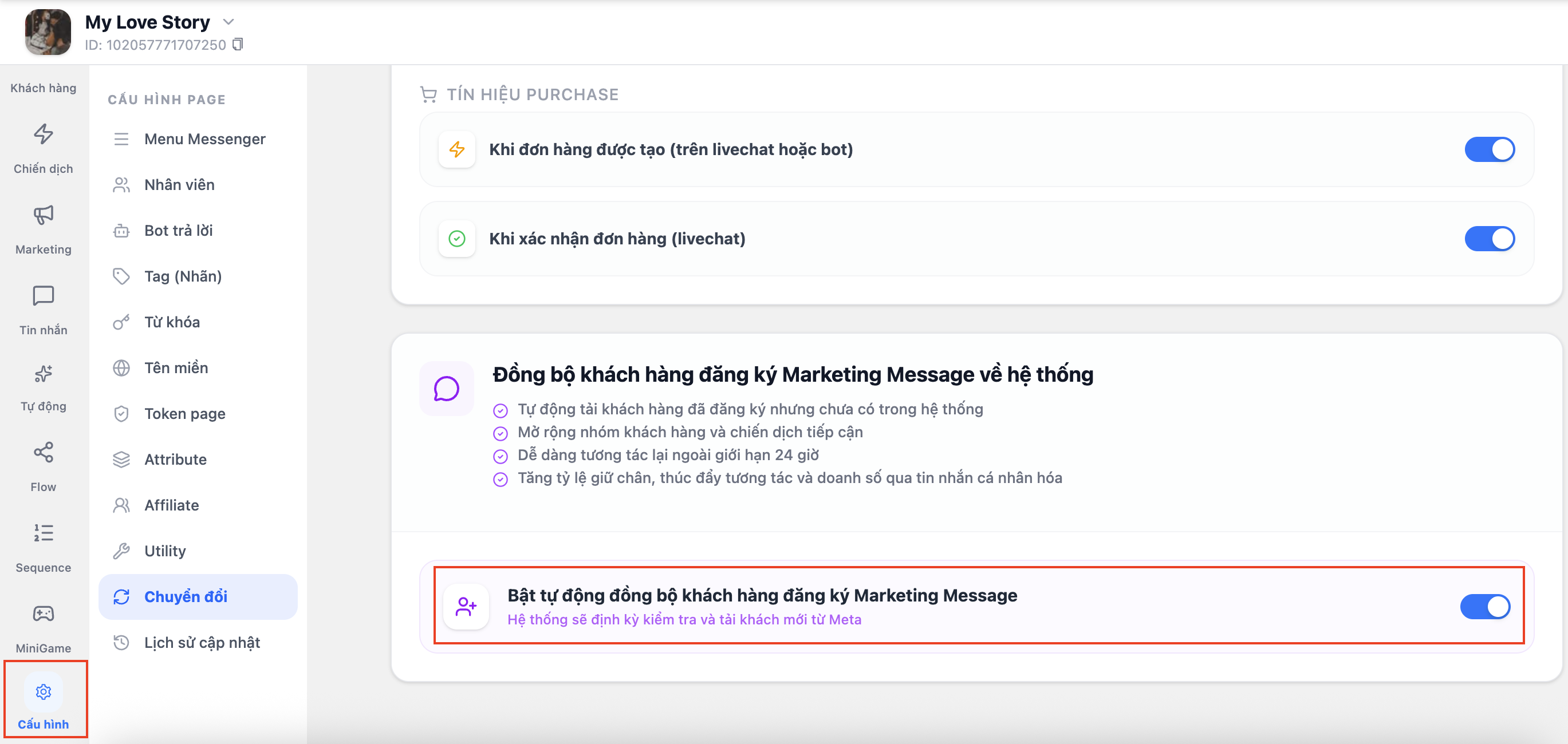 Tiếp theo, bạn vào mục Chuyển đổi >> Bật tự động đồng bộ khách hàng đăng ký Marketing Message.