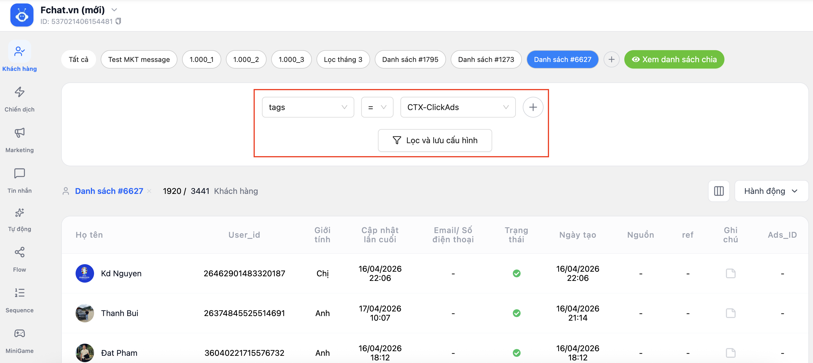 Tiếp theo, vào mục Khách hàng >> Chọn biến tags - CTX click ads >> Lọc và lưu cấu hình