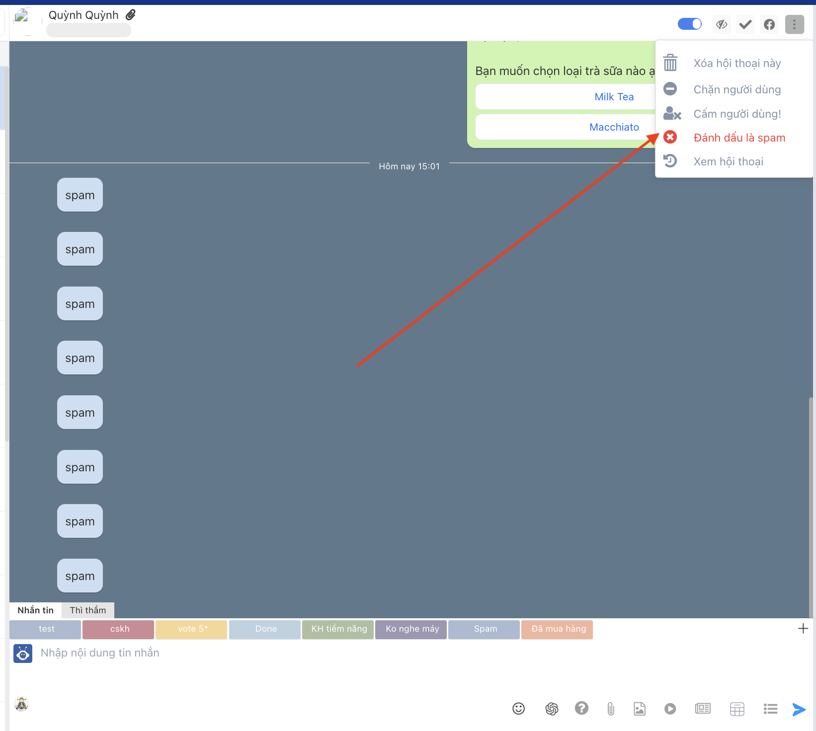 Ngay sau đó, hội thoại sẽ được gắn nhãn Spam với màu đỏ để dễ dàng nhận biết.