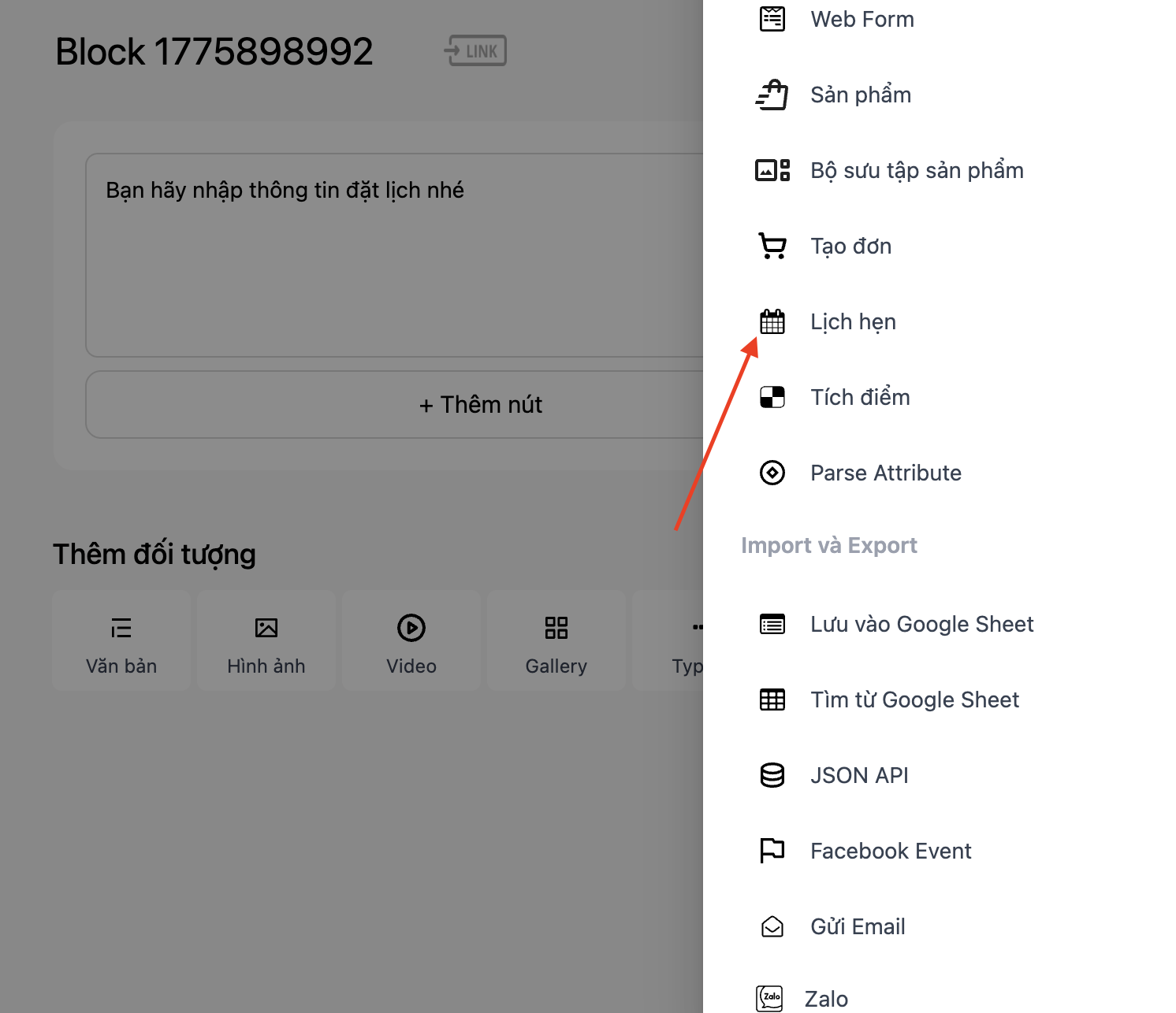 Tạo đối tượng: Bấm +More chọn đối tượng Lịch hẹn