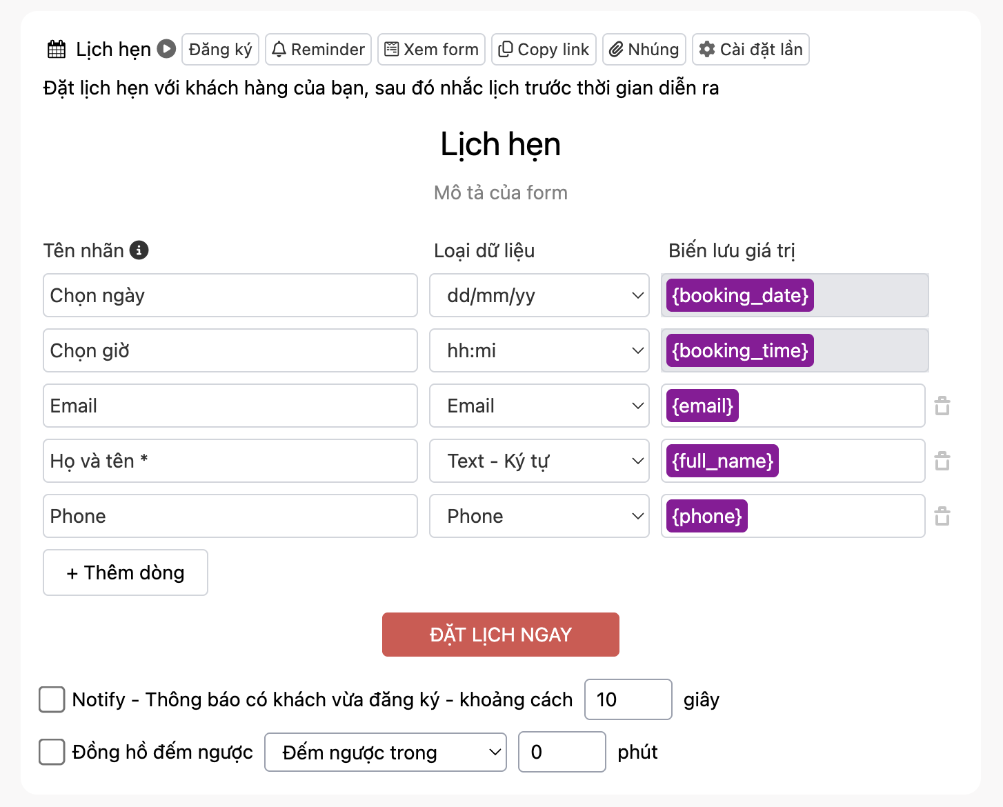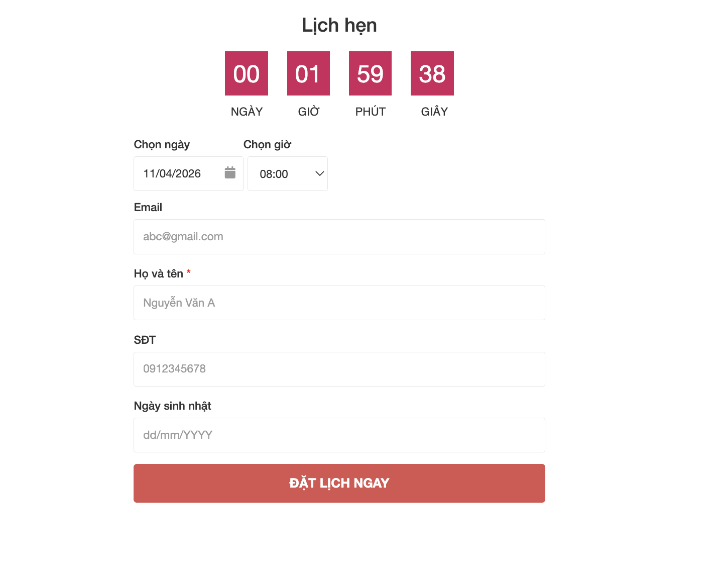 (6) Nút bấm: Tùy chỉnh tên nút bấm khi khách điền đẩy đủ thông tin để đặt lịch