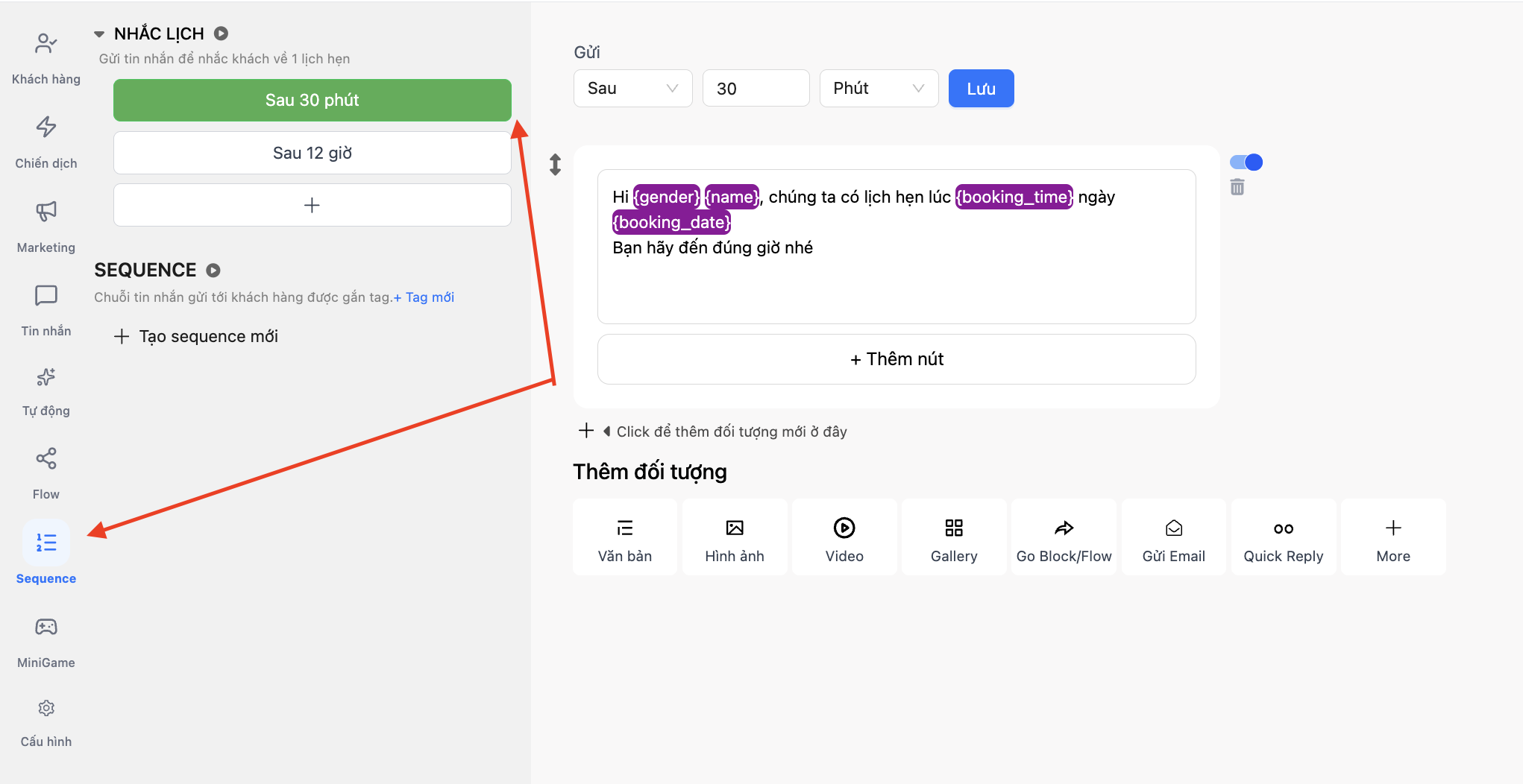 Ví dụ: Khách đặt lịch vào lúc 08:00. Bạn muốn nhắc khách trước 30' về lịch hẹn khách cần đến shop. Bạn thiết lập lịch trong sequence theo thời gian "trước-30 phút" như vậy lúc 07:30 của ngày hẹn sẽ có 1 tin nhắn được gửi tới khách từ Nhắc lịch.