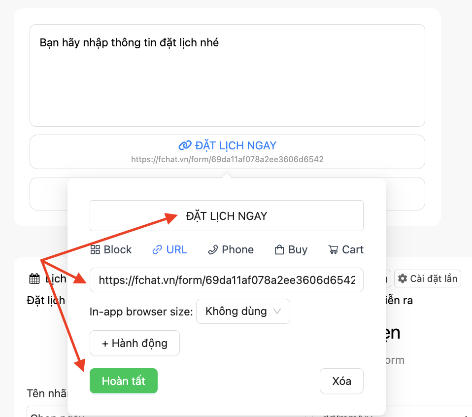 Để hoàn tất nội dung cho Form bạn thiết lập nội dung đầy đủ trong block bạn đặt link của Lịch hẹn vào nút bấm bằng cách ấn Copy Link