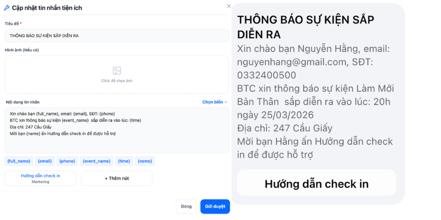 - Bạn có thể thay đổi nội dung sự kiện theo biến cho phù hợp với từng chiến dịch như: {event_name} - Tên sự kiện; {Time} - Thời gian diễn ra sự kiện; {Booking_time} - Thời gian đặt lịch,...