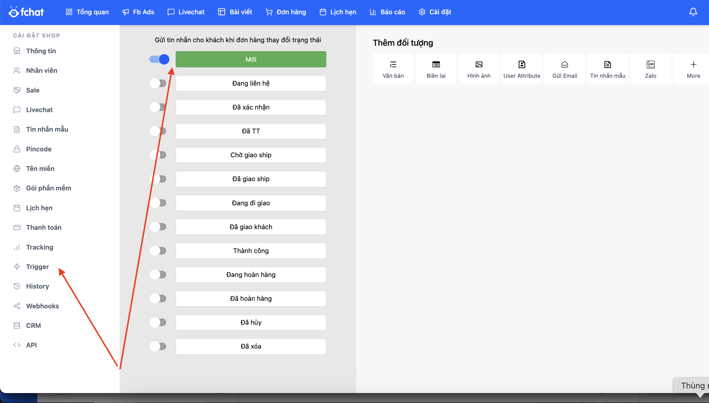 Bạn chọn Cài đặt shop ở Dashboard và chọn mục Trigger