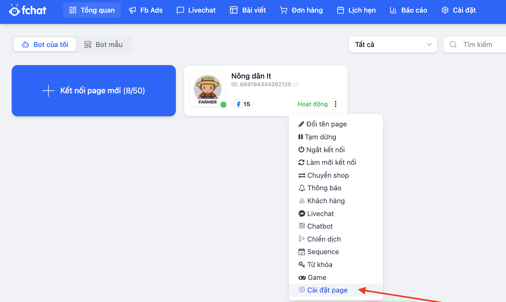 Để cài đặt tính năng này, trên màn hình Dashboard, bạn chọn một Fanpage > > Cài đặt page