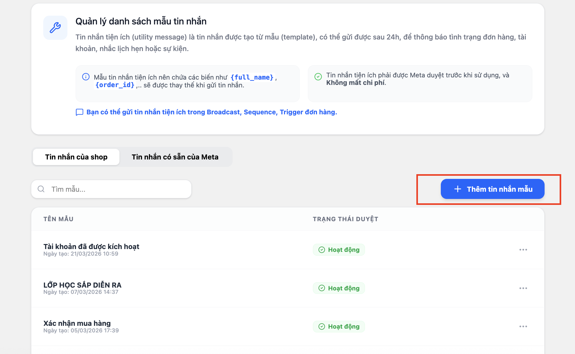 Tiếp theo, hãy chọn những Tin nhắn mẫu đã được Meta phê duyệt. Lúc này, tin nhắn ngoài 24h sẽ được gửi đi cho Khách hàng theo nội dung bạn đã cập nhật ở Tin nhắn mẫu