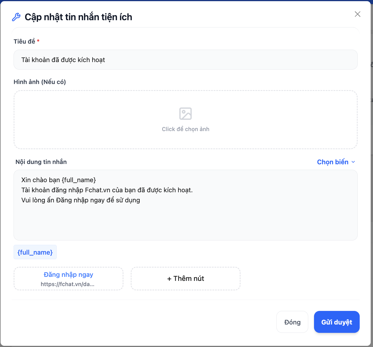 Sau khi hoàn tất nội dung, bạn nhấn “Gửi duyệt” để gửi tin nhắn lên Meta. Mỗi mẫu tin nhắn có thể cần thời gian để Facebook xét duyệt, vì vậy hãy tạo trước để đảm bảo không gián đoạn thông báo.