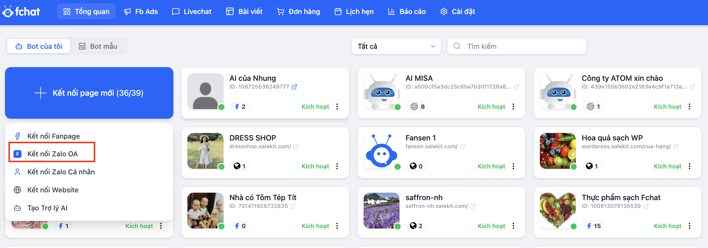 Sau khi kết nối thành công, Zalo OA sẽ được hiển thị trong Dashboard cùng với các Facebook Page (có biểu tượng Zalo).